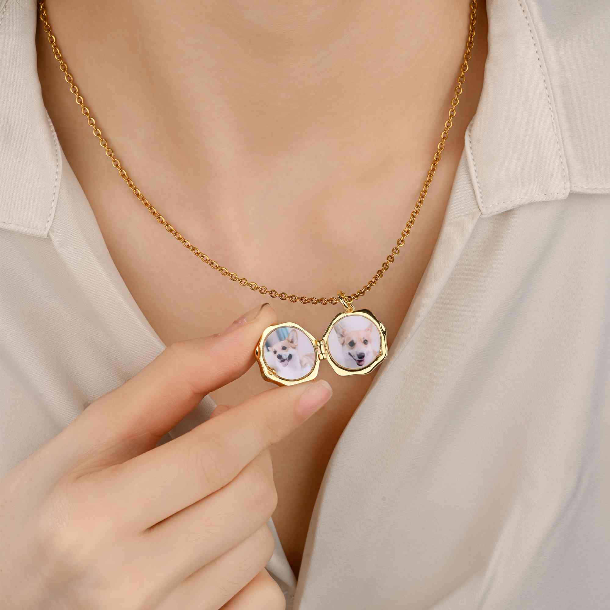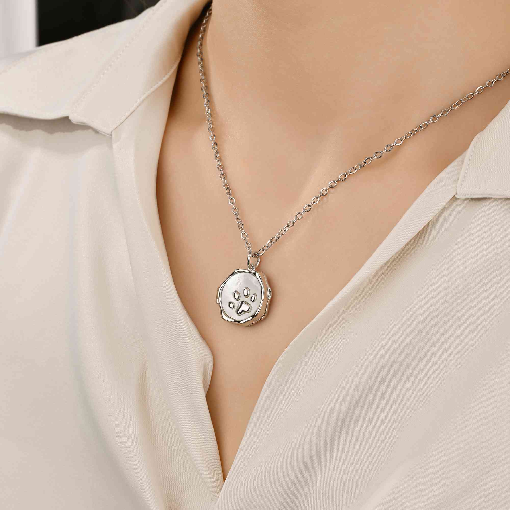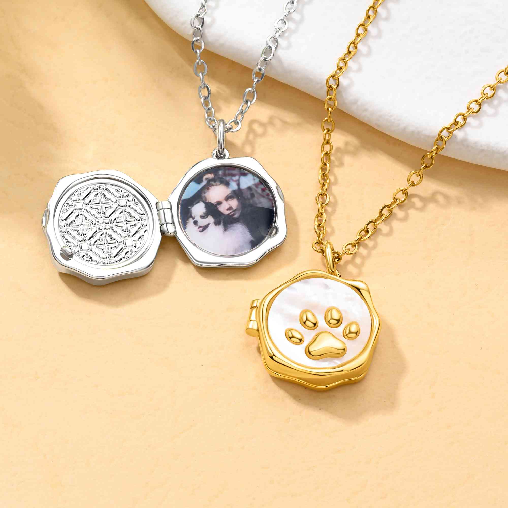 Pet Photos Design - This sentimental pet photo necklace is offered in refined platinum-plated or gold-plated brass, shaped as a delicate paw print. The locket opens to reveal a hidden space for one or two treasured pet photos, creating a subtle keepsake that blends personal meaning with timeless style.